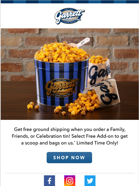 For more than 70 years Garrett Popcorn Shops has attracted passionate fans around the world with the enticing aroma and delicious taste of handmade Garrett Popcorn. Freshly Popped Popcorn Fast Easy Delivery Share The Fun. If you are using a screen reader and need additional assistance please contact our customer support team at 888-476-7267.